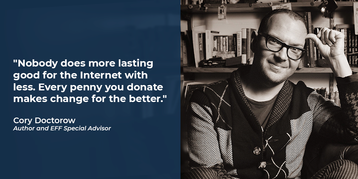 Give today to support online privacy and free expression! The Electronic Frontier Foundation’s attorneys, activists, and technologists fight for a digital world that supports freedom, justice, and innovation for all people. EFF is a US 501(c)(3) nonprofit, tax ID #04-3091431.